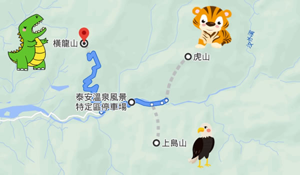 這三座山峰環繞泰安溫泉,因其形狀分別像龍、鳳、虎,故得名。